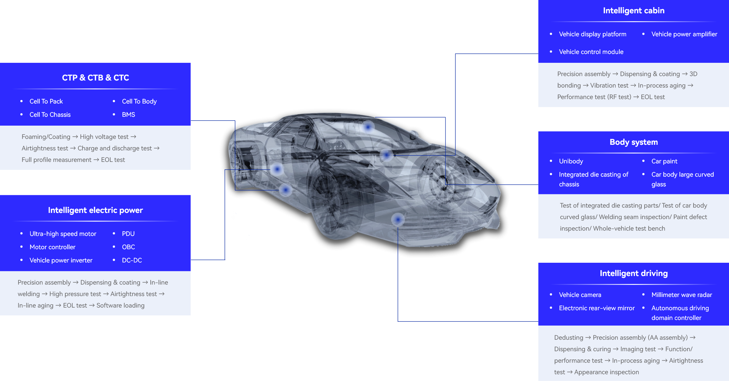 Our EV testing solution covers batteries, e-controls, e-drives (EV motor testing), and cabins with real-time yield control for new energy vehicles.